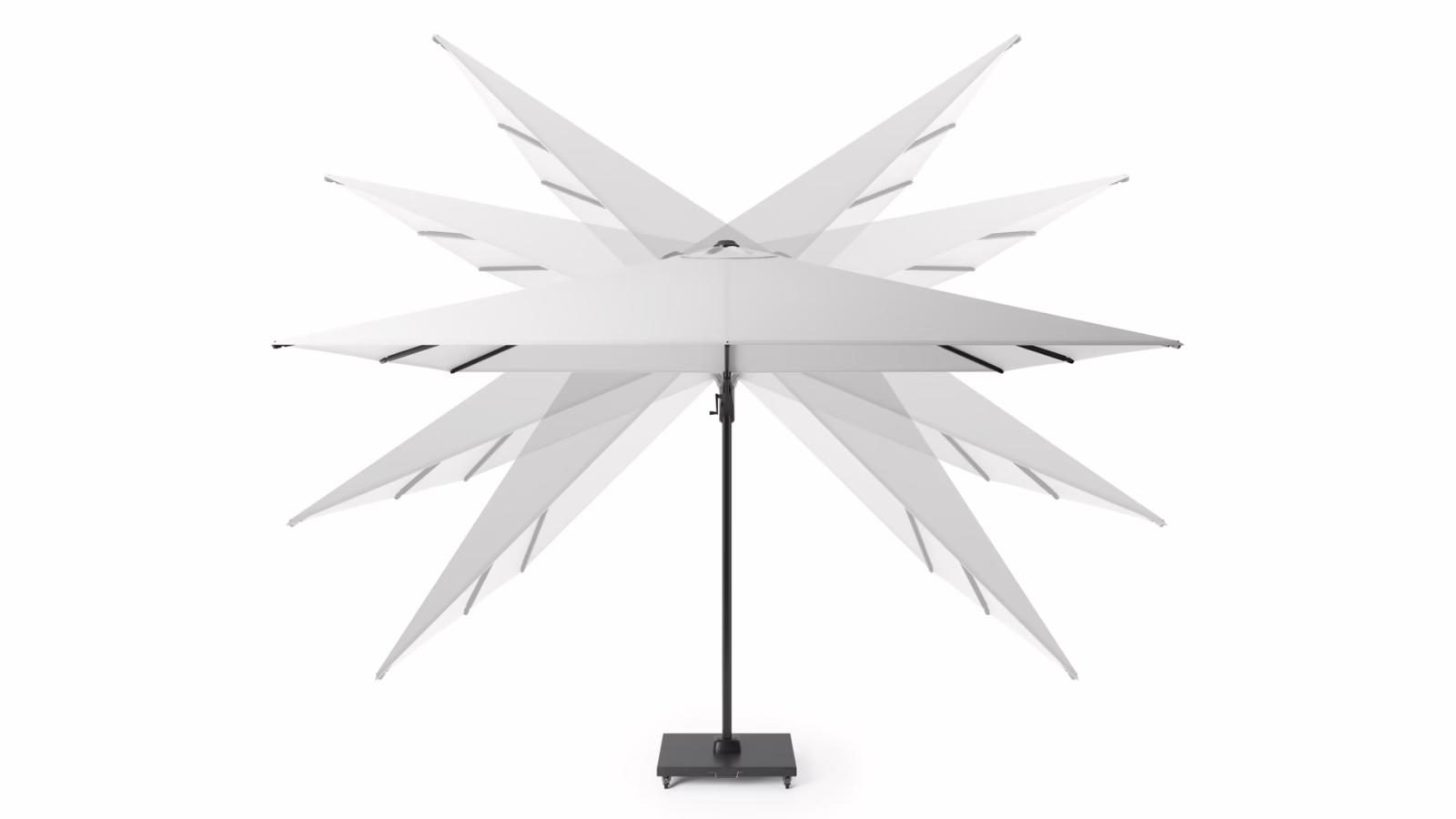 - Zapewnia duże zacienienie wybranej powierzchni, dzięki możliwości pochylenia dwupłaszczyznowego oraz podstawie obracającej się o 360°