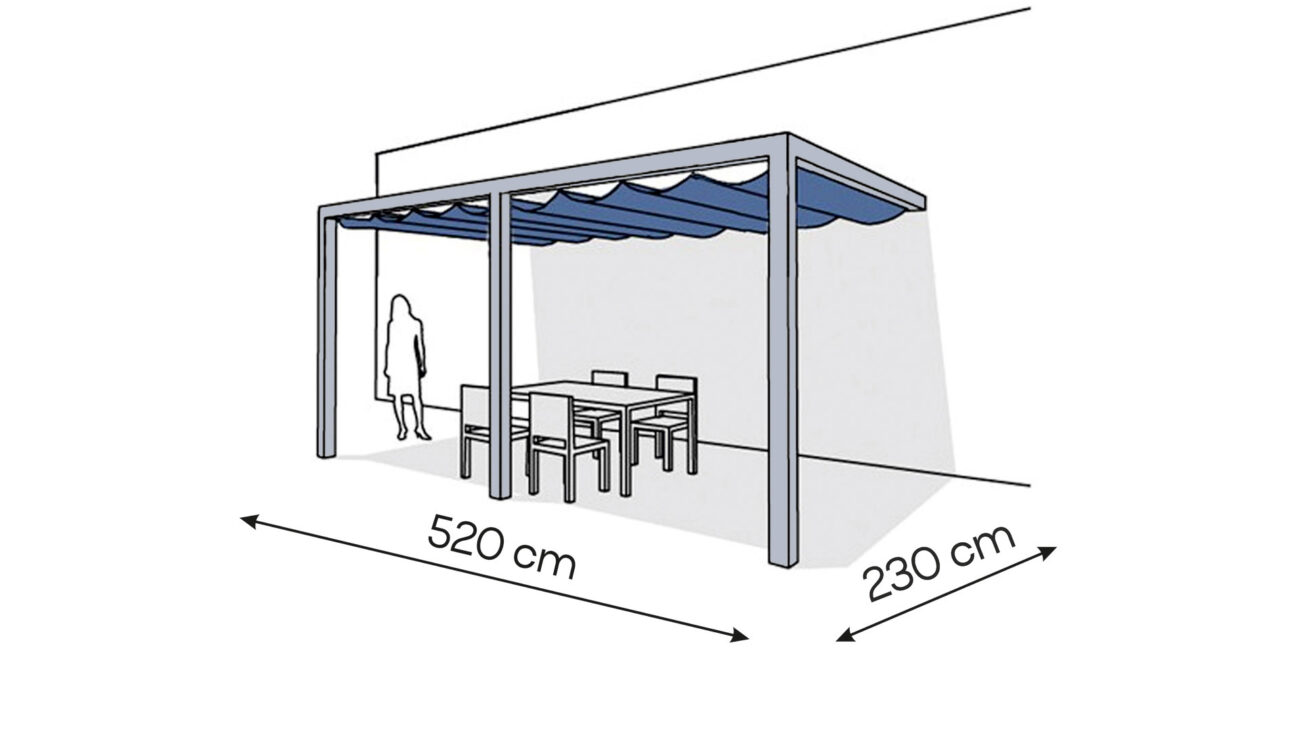 Pergola aluminiowa wraz z roletą poziomą rzymską Coolfit® tworzy pełną konstrukcję zacieniająca strefę relaksu na tarasie lub w ogrodzie. Występuje w trzech wariantach konstrukcyjnych i różnych rozmiarach. Istnieje możliwość dopasowania pergoli do każdego wymiaru tarasu.