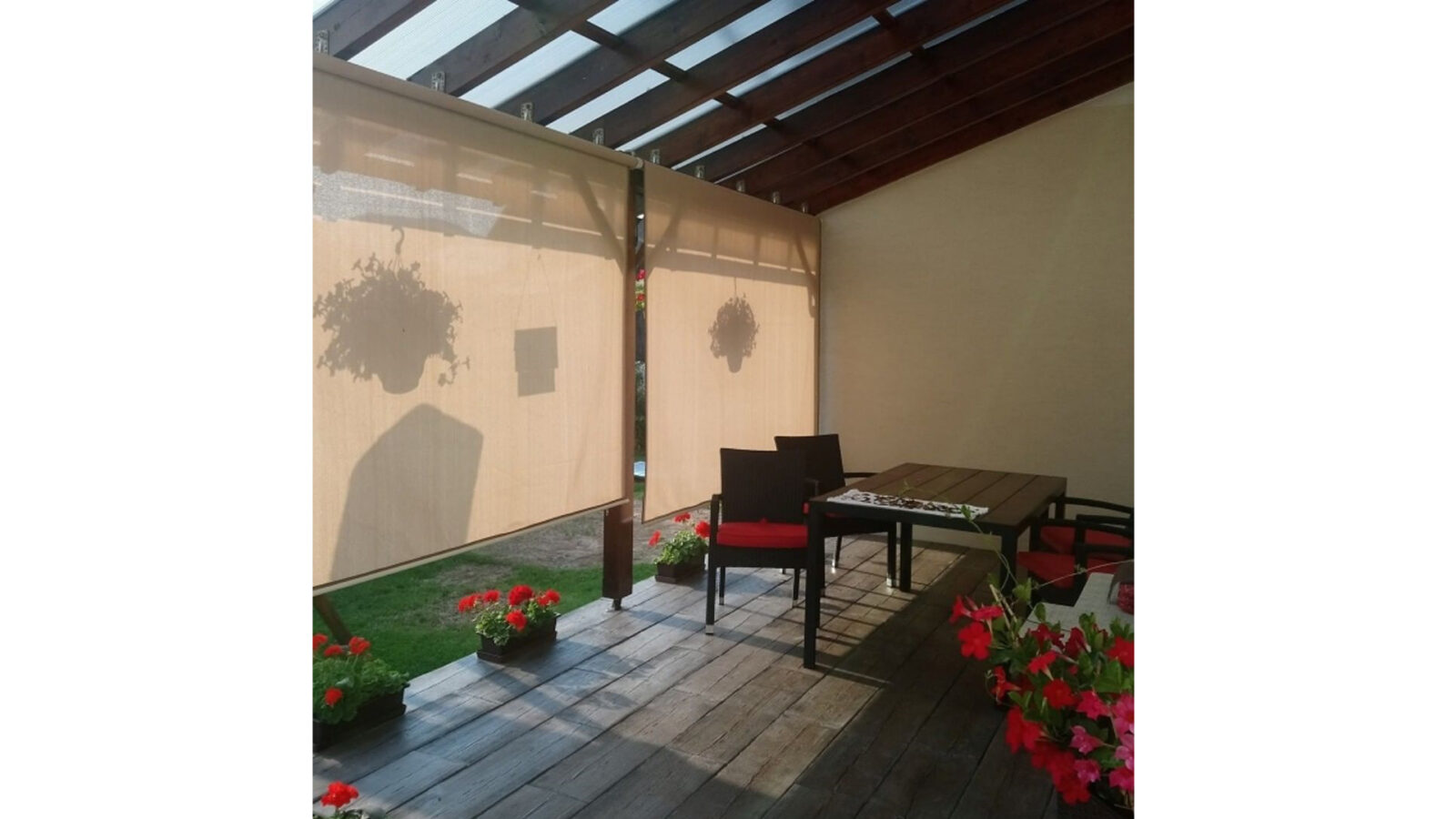 Roleta pionowa umożliwia dowolne sterowanie cieniem, w zależności od kąta padania promieni słonecznych. Roleta może posłużyć jako uzupełnienie pergoli, lub jako integralna część ramy regulowanej Flex Frame®, wraz z którą tworzy markizę balkonową.