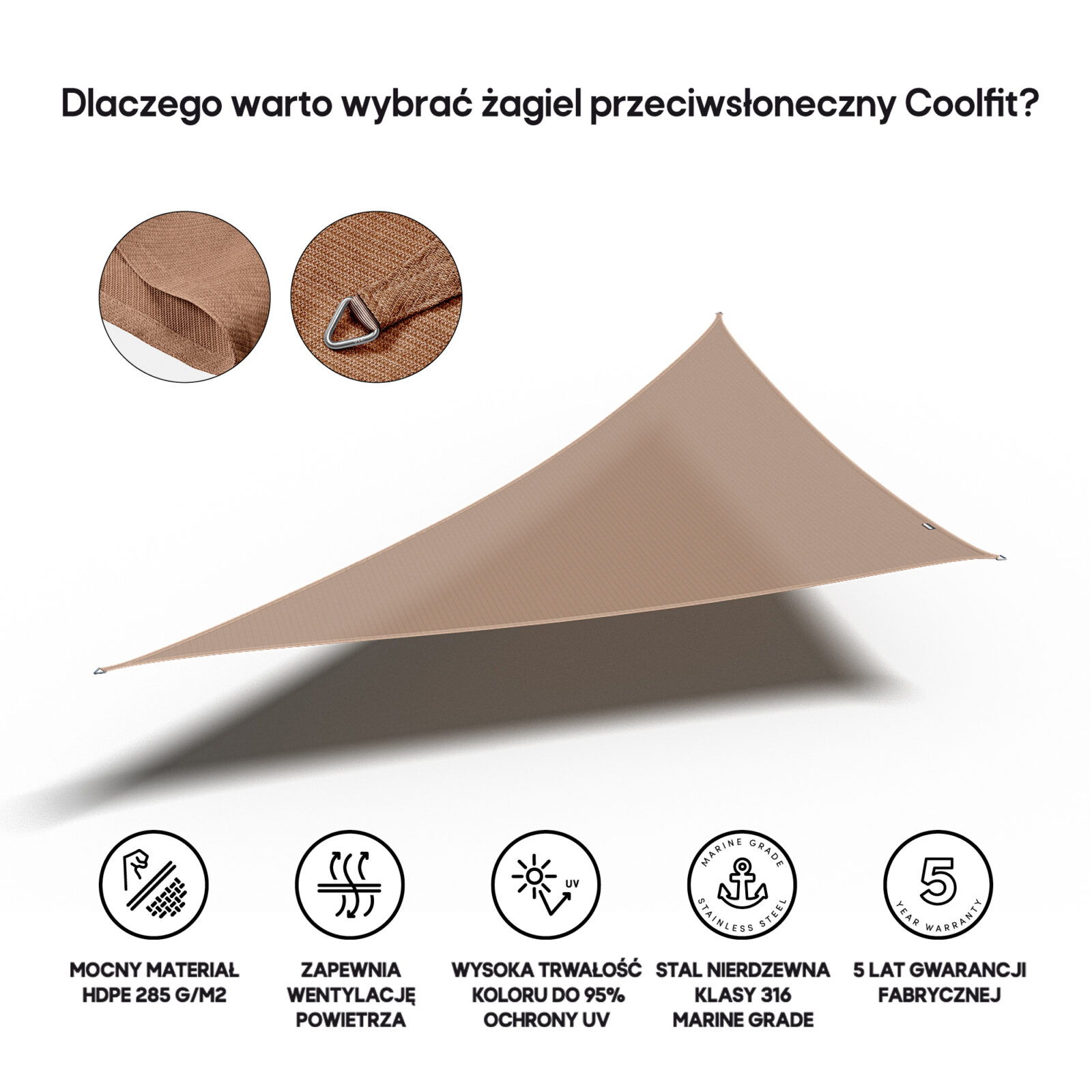 Materiał żagli przeciwsłonecznych Coolfit® to polietylen o dużej gęstości (HDPE) o gramaturze 285 g/m².